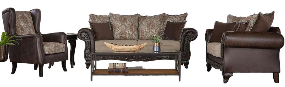 Discover a haven of traditional luxury with this exquisite three-piece sofa set, crafted with pride in the USA. Each piece, from the sumptuous sofa to the inviting loveseat and the stately chair, features a symphony of dark brown faux leather and ornate fabric patterns, united by skilled carvings and plush cushioning.Read More