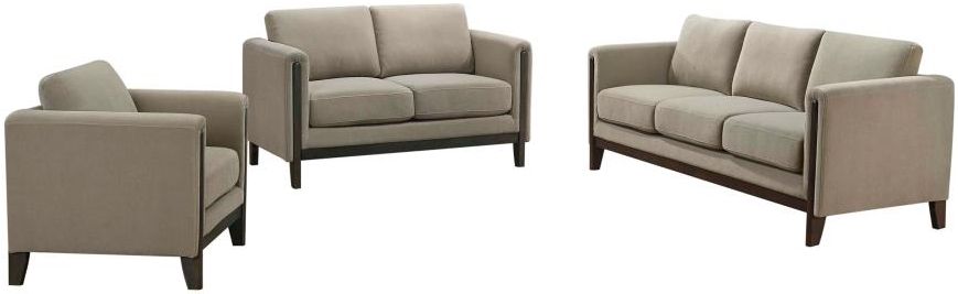 Rooted in clean architectural lines, this upholstered sofa set blends modern structure with plush comfort. Each piece is framed in engineered wood with a warm coffee finish and features recessed panel arms that lend sculptural definition.Read More