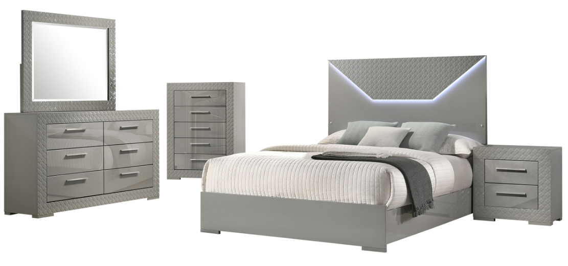 Upgrade your bedroom with this luxurious five-piece set, featuring a bed, nightstand, dresser, mirror, and chest. The set showcases a high gloss finish and 3-dimensional diamond tile emboss, offering a contemporary Italian aesthetic. Each piece is designed for both style and practicality, with ample storage options and thoughtful details like felt-lined top drawers.Read More