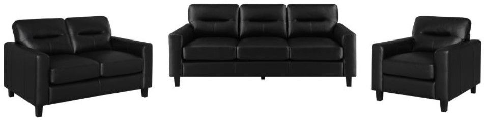 Black leatherette upholstery defines each piece with soft matte uniformity