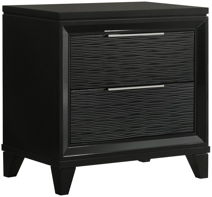 This bedroom group showcases a contemporary design characterized by sleek black finishes and clean, minimalist lines. The centerpiece is a generous bed featuring a tall, tufted headboard with integrated lighting, adding a sophisticated and functional touch.Read More