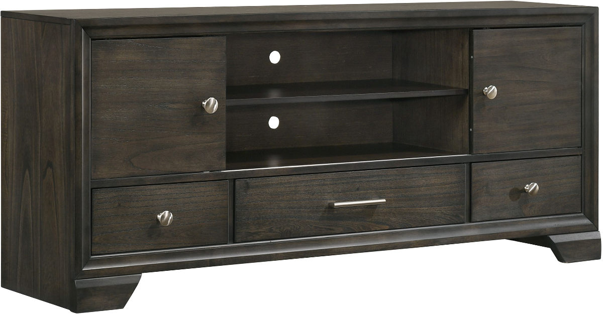 This entertainment console offers a sleek and stylish update to any space, featuring a rich, dark finish that commands attention while maintaining a sense of warmth and coziness. 2 sliding doors provide access to hidden and open shelving while lower drawers offer even more storage. Cable management holes help keep cords tidy and out of the way.Read More