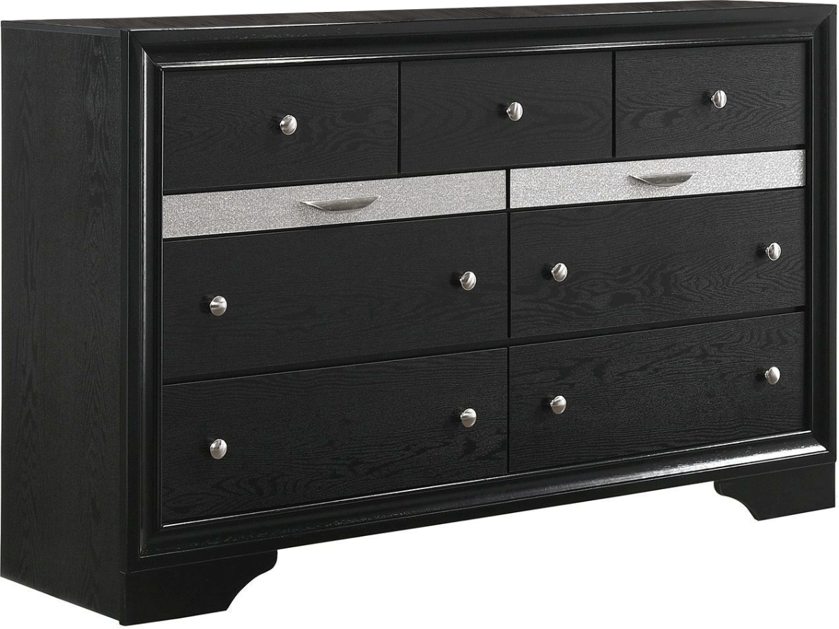 Create your own contemporary sanctuary with this Regata dresser. This piece features shimmering silver accents with elegant case designs to produce a look that is both modern and glamorous, but not over the top. Add a touch of sophistication to your bedroom while keeping your clothes organized and easily accessible with this stunning piece of furniture.Read More