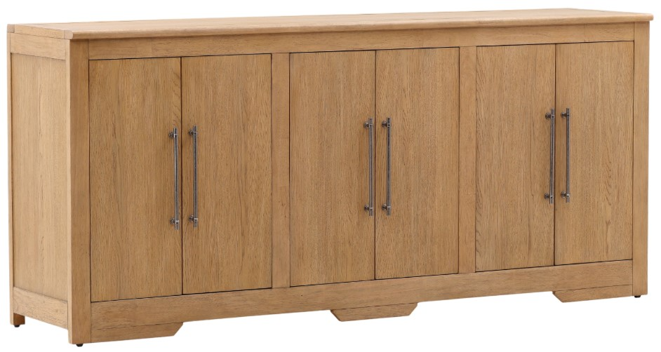 The Dovetail Furniture Delacruz sideboard in a natural finish features six paneled doors with vertical handles for a clean, streamlined look. Crafted from rubber wood and oak veneer, it offers generous concealed storage. Its warm tones and minimalist design make it a versatile and stylish addition to any space.Read More