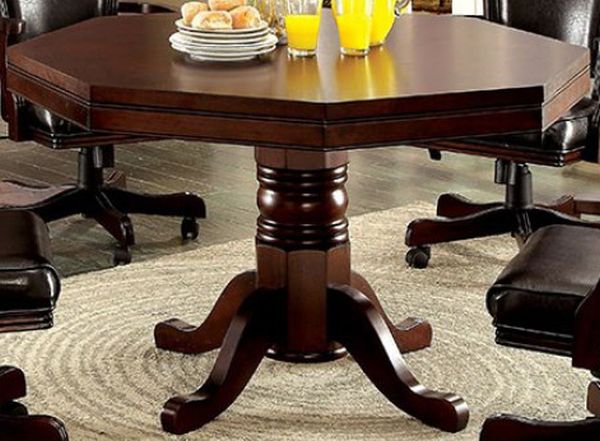 Enhance any dull entertainment space with this spacious game table and cozy padded chairs! Finished in rich cherry wood hues, it features a reversible top panel that can easily be flipped to serve two purposes: a dining table with the wooden side up or a card game table for a complete night of fun.