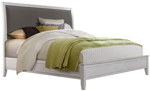 Sleigh chaise style bed features a complementing gray toned linen like upholstered panel that can be sold as a part of the collection or as a stand alone piece