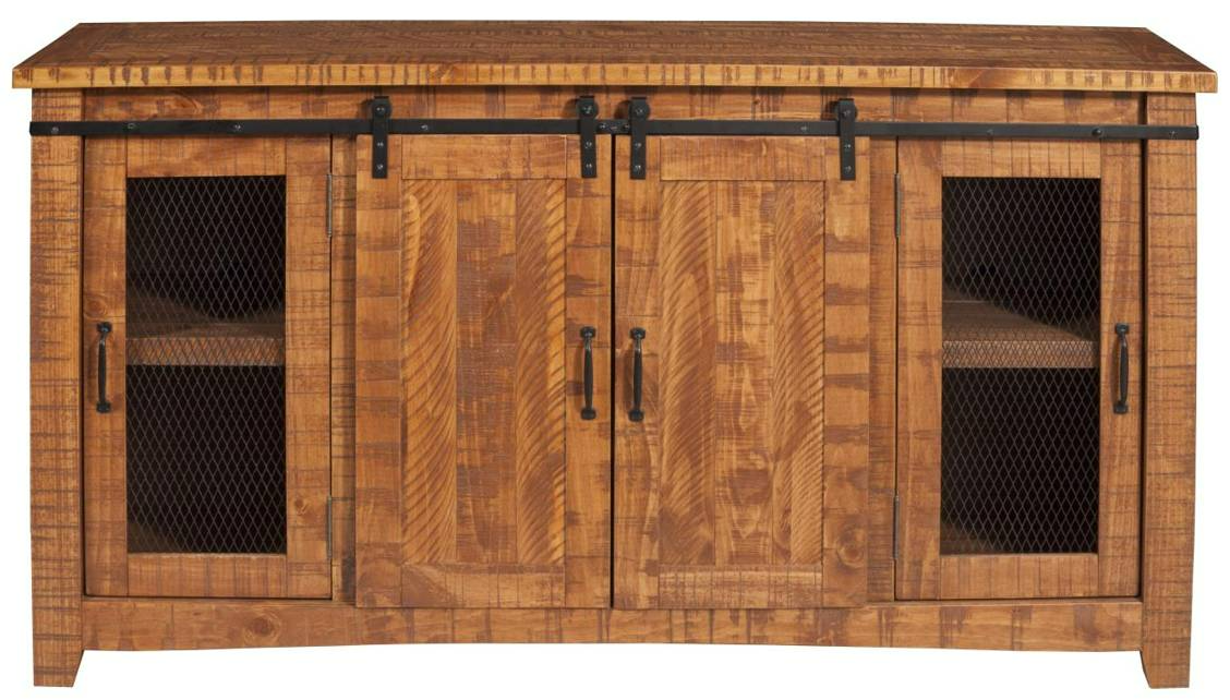 This beautiful TV console is made from roughhewn and distressed solid pine and pine veneers. Comfortable and casual farmhouse look is spot on for today's consumer. The unique barn doors roll smoothly along iron forged-style bands.Read More