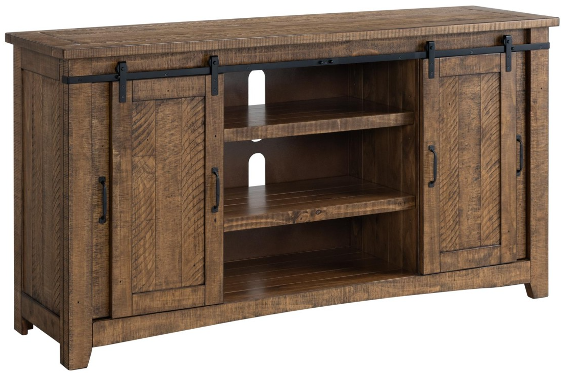 Beautiful 65 TV consoles made from roughhewn and distressed solid pine and pine veneers. This comfortable and casual farmhouse look is spot on for today's consumer. The unique barn doors roll smoothly along iron forged-style bands.Read More