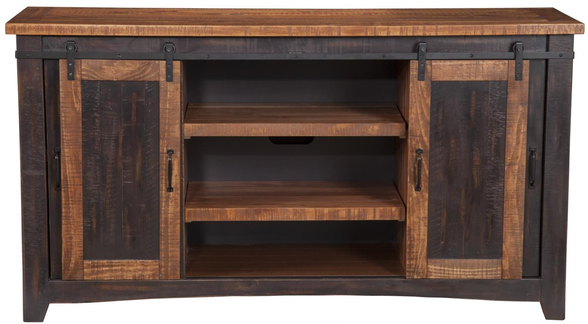Beautiful 65 TV consoles made from roughhewn and distressed solid pine and pine veneers. This comfortable and casual farmhouse look is spot on for today's consumer. The unique barn doors roll smoothly along iron forged-style bands.Read More