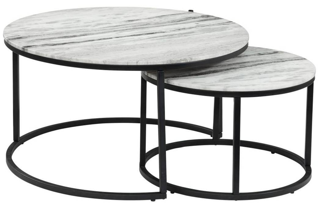 A chic cocktail table duo showcasing genuine white marble tops with unique black and gray veined patterns. Supported by slender black metal bases, their versatile design allows flexible arrangement and space‑saving elegance. Durable, modern, and eye‑catching.Read More