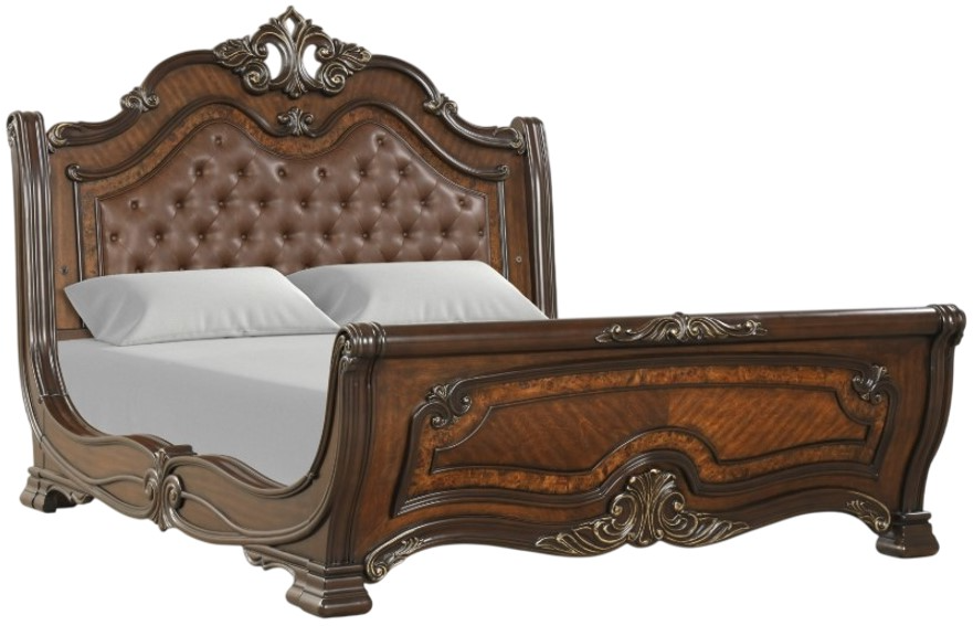 The Bella Notte wood sleigh bed is a stunning example of exquisite wood craftsmanship and timeless design. This bed is meticulously crafted from a blend of solid poplar, manufactured woods, and birch and burl wood veneers. The multi-step mahogany brown finish highlights the beautiful wood grain, showcasing intricate burl inlays that add depth and character.Read More