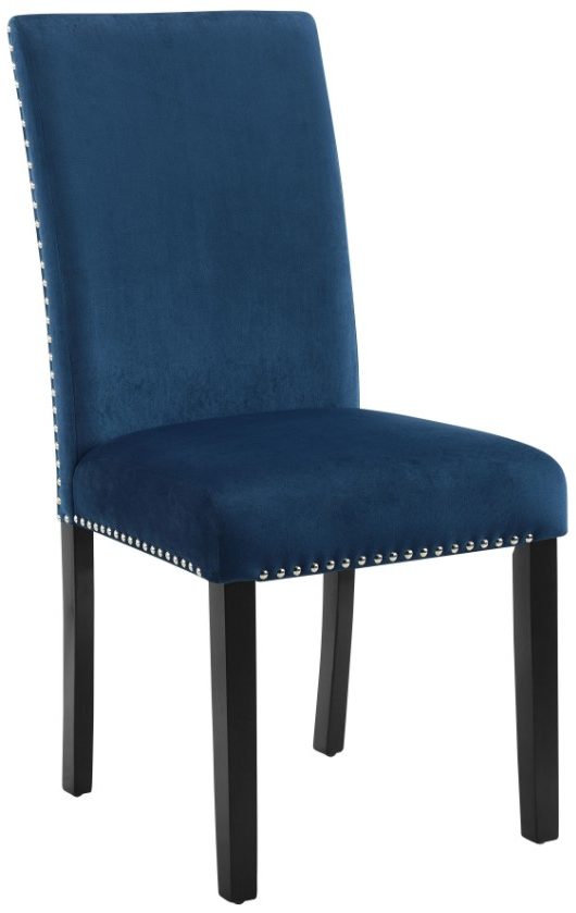 The 100% polyester royal blue velvet upholstery covers sumptuous memory foam cushions, offering both softness and durability for an easy-care, luxurious seat. The espresso legs, coupled with glimmering silver nailhead trim, add a touch of modern glamour to the plush velvet seating. Setting up these chairs is a breeze with the included easy-to-follow assembly instructions. Elevate your dining experience with the Celeste Dining Chair – where quality, comfort, and style converge effortlessly.