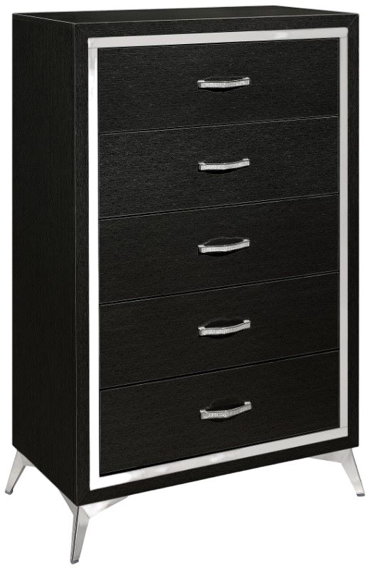 The Huxley 5-drawer chest in black combines contemporary glam with durable construction for a stylish addition to your bedroom. This vertical dresser is crafted from manufactured woods and eco-friendly decorative laminate, ensuring it will stand the test of time. The design features clean lines with metallic accents and flared silver legs.Read More