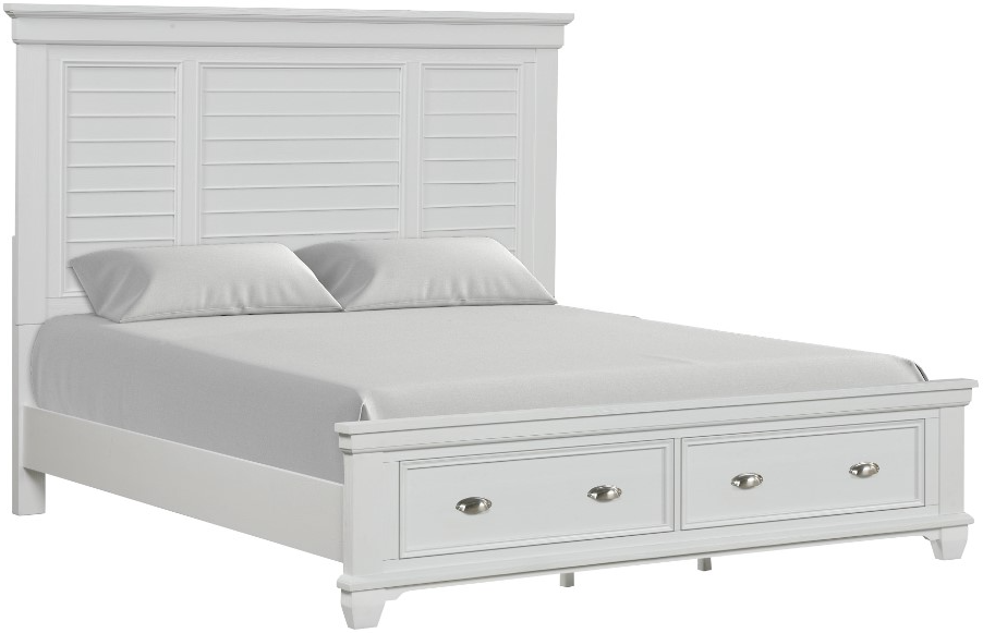 The Jamestown White King Panel Storage Bed from New Classic® Home Furnishings combines timeless elegance with practical storage. Featuring a sleek white finish, paneled headboard, and built-in storage drawers, it offers both style and functionality, making it perfect for any bedroom.Read More