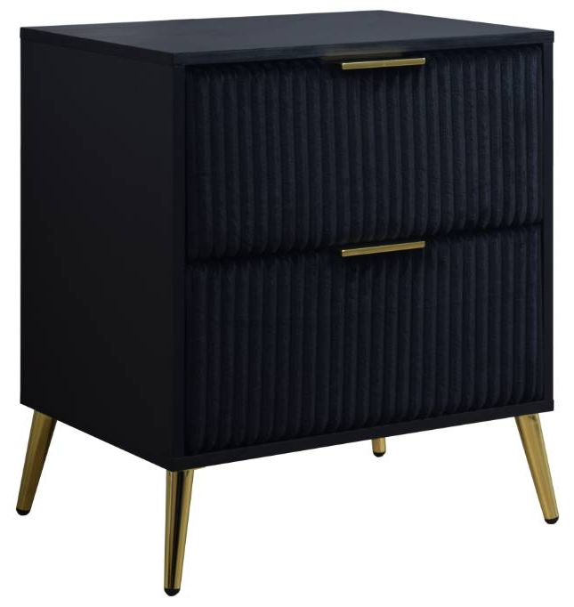 Wrapped in luxurious 100% Polyester Velvet, this Nightstand's textured drawers are enhanced by gleaming gold pulls and angled legs, adding a sophisticated touch of glamour that makes it a standout piece in any modern bedroom