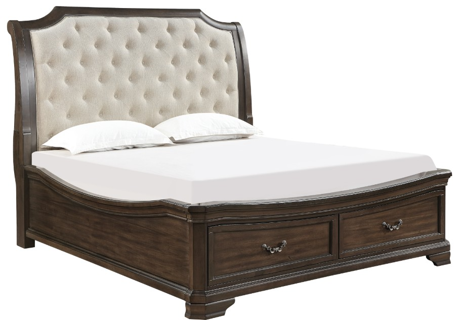 Sink into luxury against the sweeping sleigh-style headboard, upholstered in sumptuous 100% polyester, while the storage footboard optimizes space. Substantial moldings, bracket feet, and ornate hardware define the masterful style of this statement bedroom ensemble.Read More