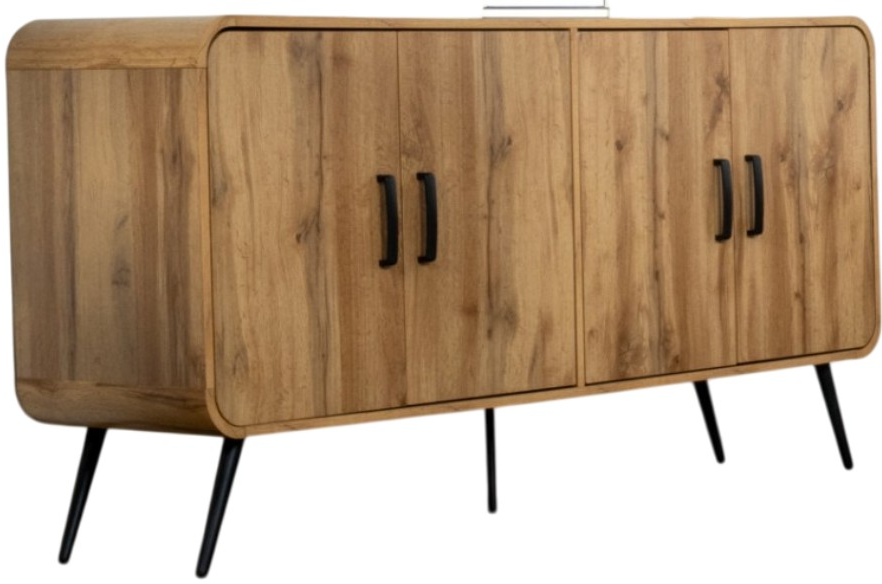 The Rowan 63" sideboard doubles as a stylish tv stand with mid-century modern flair. Crafted from eco-friendly manufactured wood in a warm oak finish, it features rounded corners, black hardware, and tapered legs. Four cabinet doors conceal spacious shelves perfect for storing media, electronics, or dining essentials. A versatile piece that works beautifully in living or dining spaces.Read More