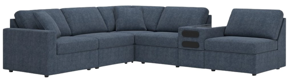 Includes 6 Modular Pieces: Left-arm facing corner chair, 3 armless chairs, wedge and audio console with storage