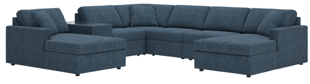 Includes 7 modular pieces: left-arm facing corner chaise, console with storage, 3 armless chairs, wedge and right-arm facing corner chaise